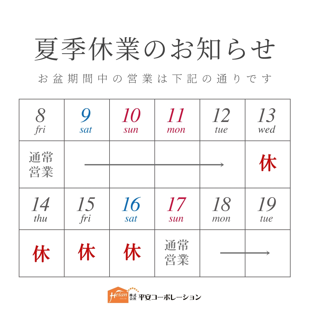 弊社では、誠に勝手ながら下記日程を夏季休業とさせていただきます。